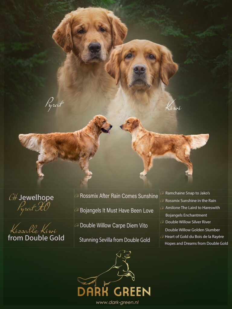 We are very excited about 2026, when we hope to welcome a beautiful litter of Golden Retriever puppies. The pairing of our sparkling Kiwi (Kissable Kiwi from Double Gold) and the handsome Swiss sire Pyrat (Jewelhope Pyrat XO) has been carefully planned for their health, excellent temperament, natural working ability, and overall quality.